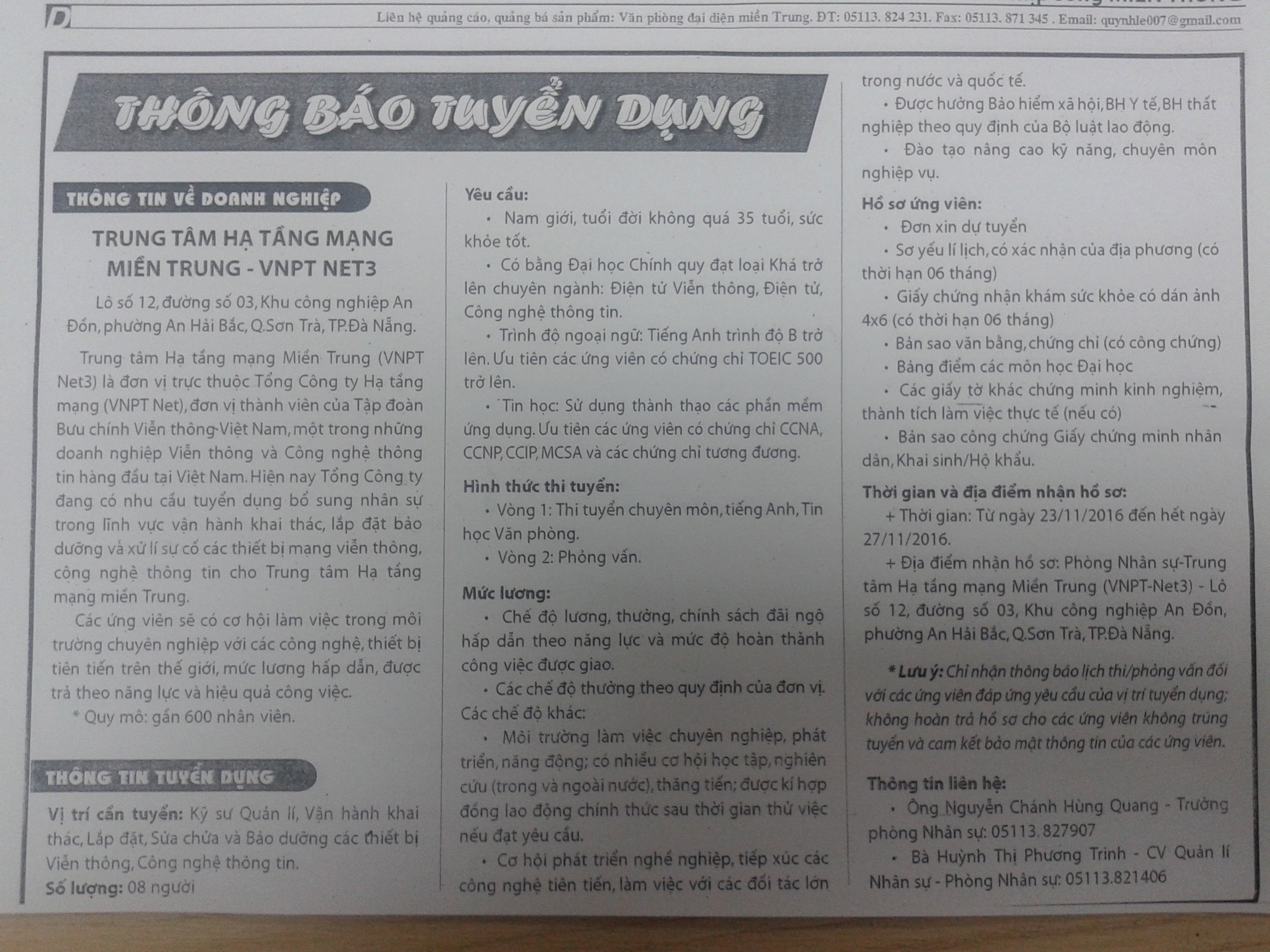 Thông báo Trung tâm hạ tầng Mạng Miền Trung tuyển dụng